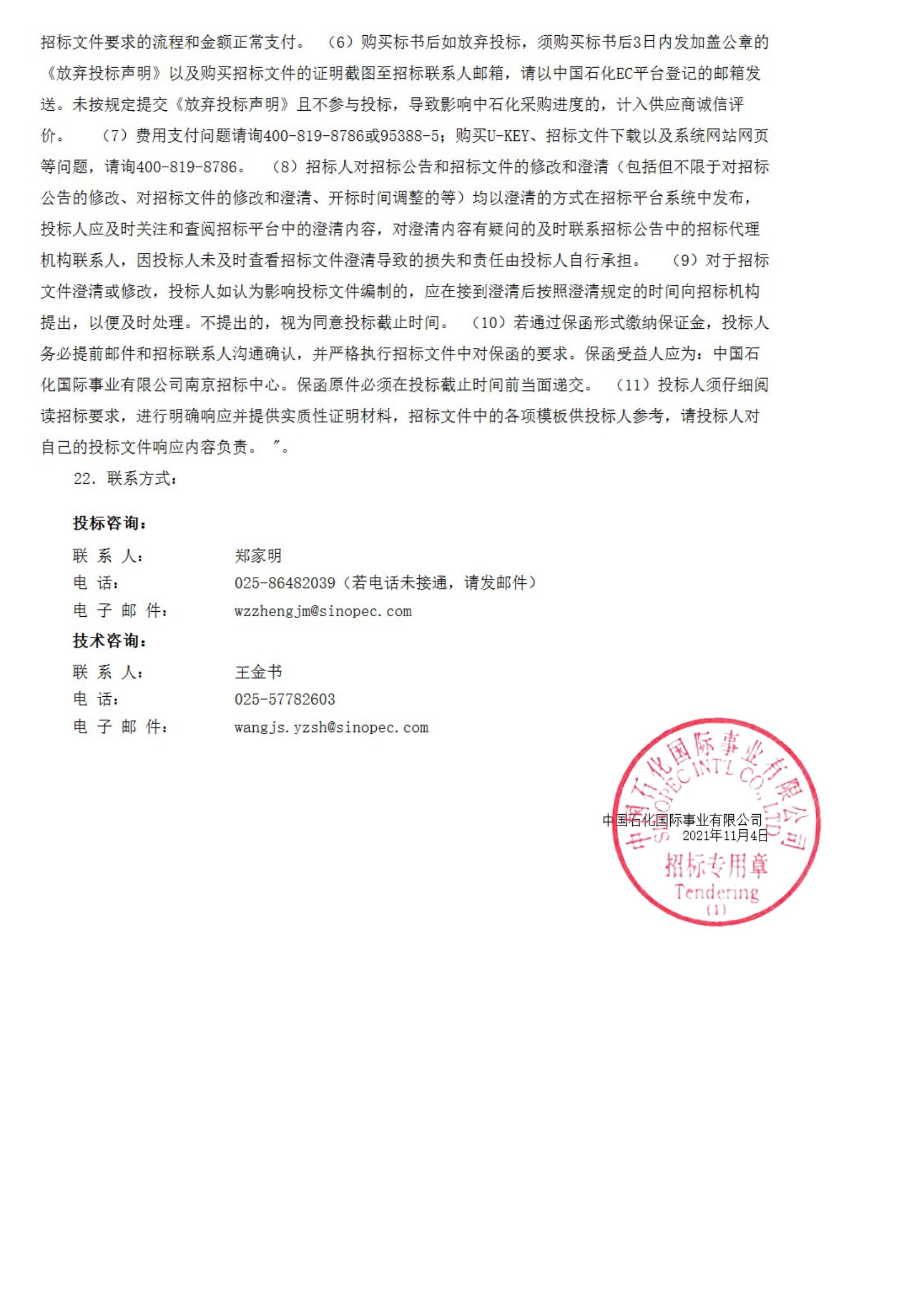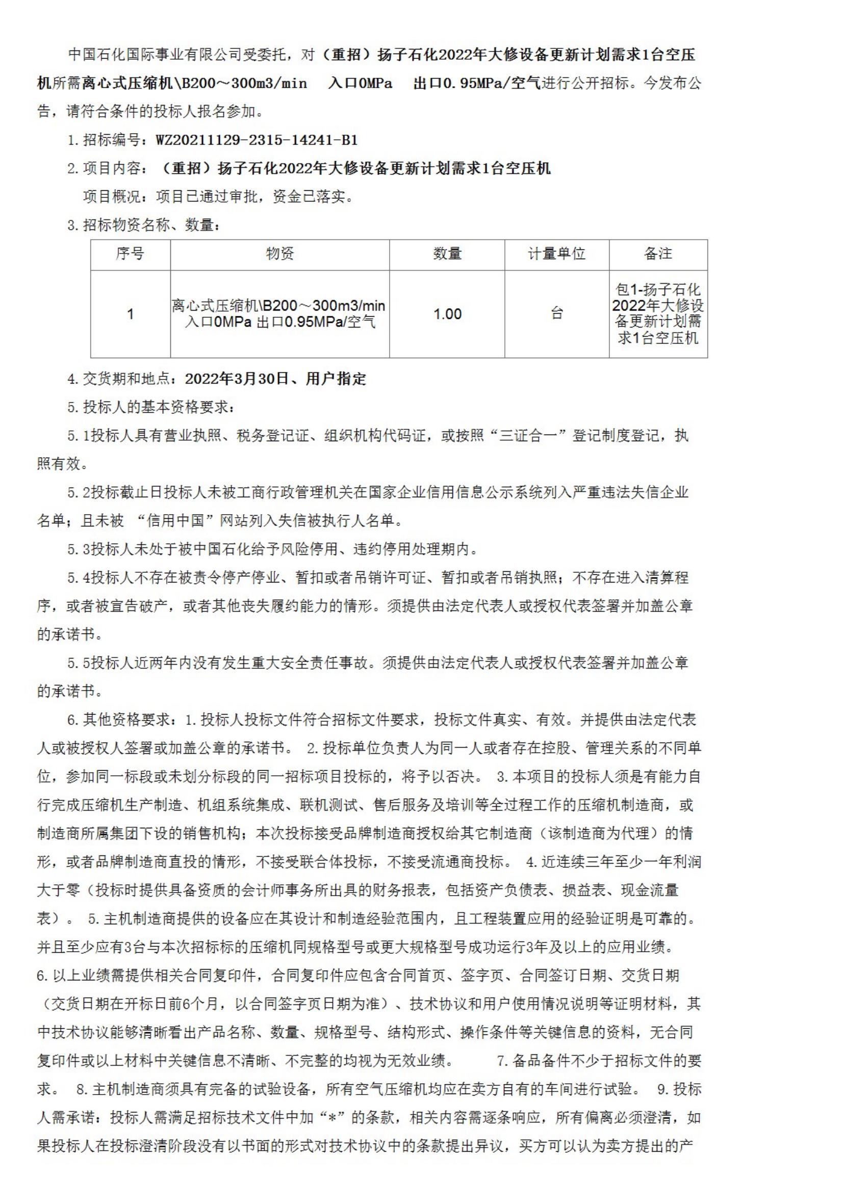 中國石化物資裝備部(國際事業公司)揚子石化2022年大修設備更新計劃離心式壓縮機B200~300m3/min 入口0MPa 出口0.95MPa/空氣招標公告