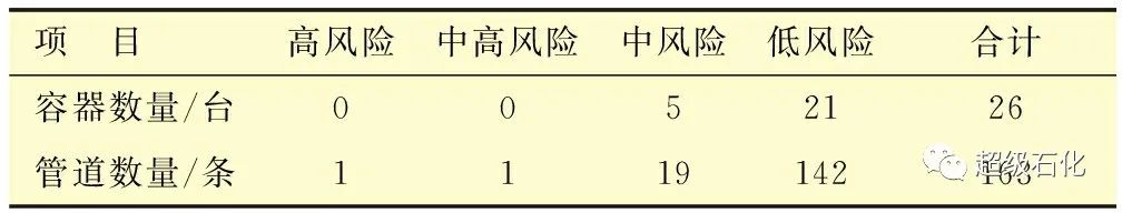 (3)通過RBI技術的應用,制定了相應的定期檢驗策略,建議進行開蓋檢驗的中風險的容器有5臺,低風險的容器有21臺,建議進行在線檢驗的高風險的管道有1條,低風險的管道有6條。