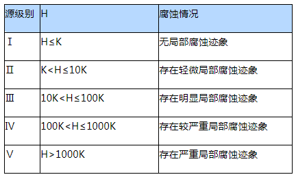 按照J(rèn)B/T 10764-2007標(biāo)準(zhǔn)的規(guī)定,采用聲發(fā)射源的區(qū)域定位分析及下表所示分級方法進(jìn)行儲罐底板數(shù)據(jù)分析。表中H為單個通道每小時出現(xiàn)的撞擊數(shù),K值通過相同的檢測儀器與工作參數(shù)對相同規(guī)格和運(yùn)行條件的儲罐進(jìn)行一定數(shù)量的檢測試驗(yàn)和開罐驗(yàn)證試驗(yàn)取得。
